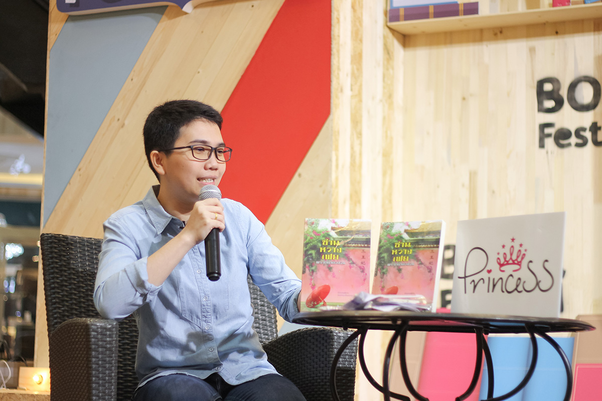 Riordan เจ้าของผลงาน “กู่มี่เอิน ต้าเจี่ยผู้ยิ่งใหญ่” และ Ana K. เจ้าของผลงาน “ซานหวางเฟยพระชายาตัวป่วน” สองนักเขียนจากปริ๊นเซส นิยายจีนเครือสถาพรบุ๊คส์ ขึ้นเวทีให้สัมภาษณ์ถึงประสบการณ์การอ่านตั้งแต่วัยเยาว์ ที่ส่งผลให้เกิดแรงบันดาลใจในการเขียนหนังสือ รวมทั้งเล่าถึงเส้นทางการเป็นนักเขียนจาก“ออนไลน์” สู่ “หนังสือเล่ม” กับสำนักพิมพ์ด้วย เป็นการขึ้นเวทีครั้งแรกของสองนักเขียนแต่ได้ให้ประโยชน์ และแนวคิดเกี่ยวกับคุณค่าของการอ่านแก่ผู้ฟังอย่างเต็มอิ่ม