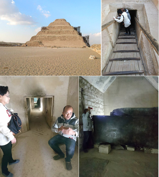 3.พีระมิดขั้นบันได หรือที่เรียกกันว่า Step Pyramid พีระมิดขั้นบันไดแห่งซัคคาราแห่งนี้ นับเป็นพีระมิดที่เก่าแก่ที่สุดสร้างโดยมหาเสนาบดีอิมโฮเทปผู้มีอัจฉริยภาพหาตัวจับยาก ให้ลืมภาพตัวร้ายจากหนังเรื่องมัมมี่ไปได้เลยนะคะ ตัวจริงในประวัติศาสตร์นั้นเก่งกาจฉลาดเฉลียวอย่างยิ่งค่ะ พีระมิดขั้นบันไดนี่เหละที่จะพัฒนาไปเป็นพีระมิดแท้ที่มีผิวด้านนอกเรียบแบบมหาพีระมิดแห่งกีซ่า ชญาน์พิมพ์กับคณะได้มีโอกาสมุดลงไปหนึ่งในสุสานด้วยนะคะ ขอร้องคุณกิตติเลยค่ะว่าอยากลงไปดูเพื่อทำความเข้าใจความรู้สึกของตัวละครยามต้องมุดลงไปใต้พีระมิด แล้วก็สมใจค่ะ