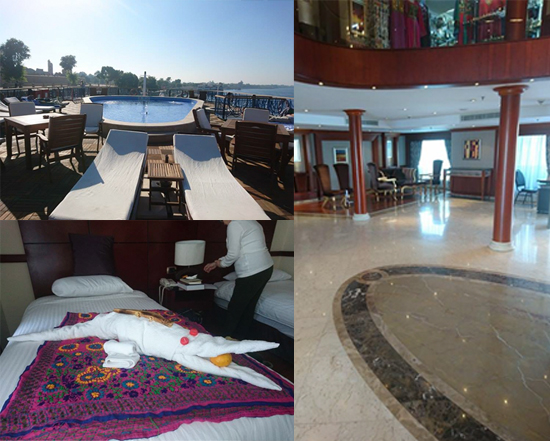 4.ล่องเรือสำราญบนแม่น้ำไนล์ ฟังดูหรูหราใช่ไหมคะ ที่จริงถ้าเลือกเรือหรูก็หรูเอาการค่ะ แต่ถ้าเลือกในระดับรองๆ ลงมาก็จะได้ราคาที่สบายกระเป๋าและได้รับการบริการที่น่าประทับใจค่ะ แบดเพื่อนรักจองเรือ Amwaj ให้ในราคาที่ดีงาม 1 ห้องพัก เรานอนกัน 3 คน พร้อมไกด์ชาวอียิปต์ 1 คนชื่อ Amro Ghanem อัมโรจะคอยดูแลอำนวยความสะดวกเฉพาะเรา 3 คน ทำให้การนัดหมายต่างๆ ง่ายและรวดเร็วกว่ากลุ่มใหญ่ เรือจะจอดตามโบราณสถานต่างๆ ให้เราไปเยี่ยมชมอย่างสะดวกสบาย การบริการในเรือนั้นดีเยี่ยม ห้องพักสวยงามสะอาดสะอ้าน พนักงานบนเรือลำนี้ขี้เล่นมากค่ะ เวลาเราออกไปเที่ยว พวกเขาจะมาทำความสะอาดห้อง พร้อมพับผ้าเช็ดตัวเป็นรูปสัตว์ต่างๆ ไว้บนเตียงนอน ทั้งจระเข้เอย ช้างเอย กลับเข้าห้องมาก็ลุ้นทุกวันนะคะว่าบนเตียงจะมีตัวอะไรรออยู่ ยกนิ้วให้กับความคิดสร้างสรรค์เลยค่ะ