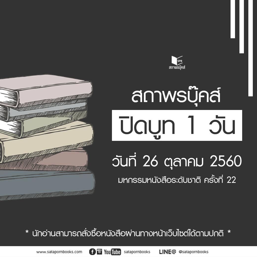 บูทสถาพรบุ๊คส์ เลขที่ B04 โซน Plenary Hall จะขอปิดบูทในวันที่ 26 ตุลาคม 2560 ตั้งแต่เวลา 10.00 น. เป็นต้นไป