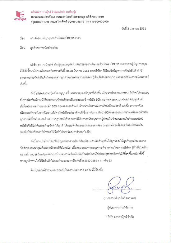 บริษัท สถาพรบุ๊คส์ จำกัด ผู้ดูแลและจัดพิมพ์นวนิยายวายในนามสำนักพิมพ์ DEEP ขอขอบคุณผู้มีอุปการคุณที่ได้สั่งซื้อนวนิยายพรีออเดอร์ระหว่างวันที่ 20-28 มีนาคม 2561 ทางบริษัทฯ ได้รับแจ้งปัญหาการจัดส่งสินค้าล่าช้า ตลอดจนการจัดส่งสินค้าผิดพลาดจากลูกค้าหลายท่าน ทางบริษัทฯ รู้สึกเสียใจอย่างมาก และขออภัยในความผิดพลาดที่เกิดขึ้น