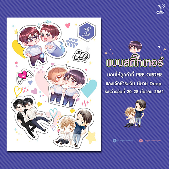> สติ๊กเกอร์ จัดทำขึ้นมาเป็นพิเศษ มอบให้ลูกค้าที่ Pre-order และแจ้งชำระเงิน หนังสือของสำนักพิมพ์ Deep เข้ามา ในระหว่างวันที่ 20-28 มีนาคม 2561