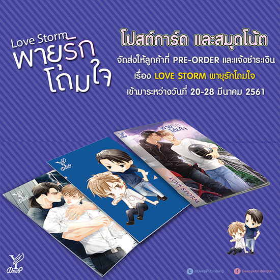 > โปสต์การ์ด และสมุดโน้ต จากเรื่อง Love Storm พายุรักโถมใจ เนื่องจากลูกค้าบางท่านที่สั่งซื้อนวนิยายเรื่อง Love Storm พายุรักโถมใจ ไม่ได้รับโปสต์การ์ดและสมุดโน้ต ทางบริษัทจึงจะ "จัดส่ง ทั้งโปสต์การ์ดและสมุดโน้ต เรื่อง Love Storm พายุรักโถมใจ ให้อีกครั้ง" สำหรับลูกค้าที่ Pre-order และแจ้งชำระเงิน เรื่อง Love Storm พายุรักโถมใจ เข้ามาระหว่างวันที่ 20-28 มีนาคม 2561
