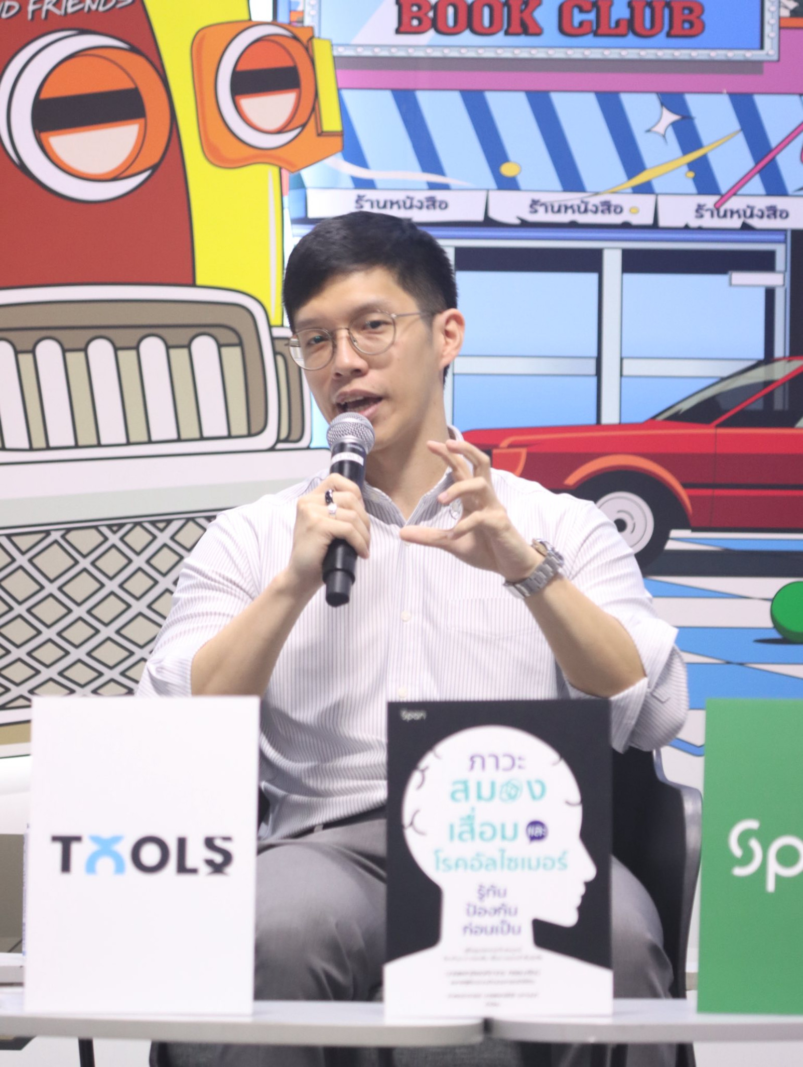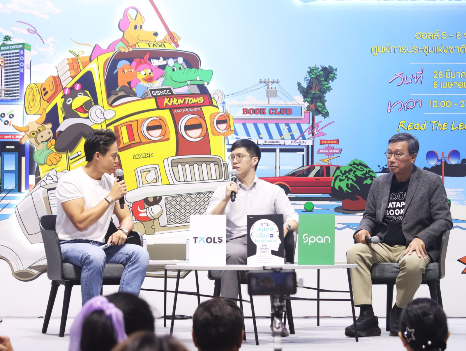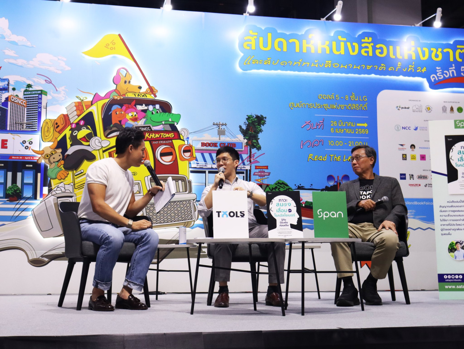 ภาพบรรยากาศการพูดคุยเกี่ยวกับหนังสือเรื่อง ‘ภาวะสมองเสื่อมและโรคอัลไซเมอร์: รู้ทัน ป้องกันก่อนเป็น’ โดยนายแพทย์พงศ์ภากร ศรธนะรัตน์ และคุณวรพันธ์ โลกิตสถาพร ประธานเจ้าหน้าที่บริหาร บริษัทสถาพรบุ๊คส์ จำกัด พร้อมพิธีกร คุณพชรพล ทรัพย์เปี่ยมลาภ ณ เวทีกลาง ในงานสัปดาห์หนังสือแห่งชาติ ครั้งที่ 54 และสัปดาห์หนังสือนานาชาติ ครั้งที่ 24 ที่ศูนย์การประชุมแห่งชาติสิริกิติ์ ซึ่งกิจกรรมนี้ได้รับความสนใจจากผู้เข้าร่วมฟังเป็นอย่างมาก