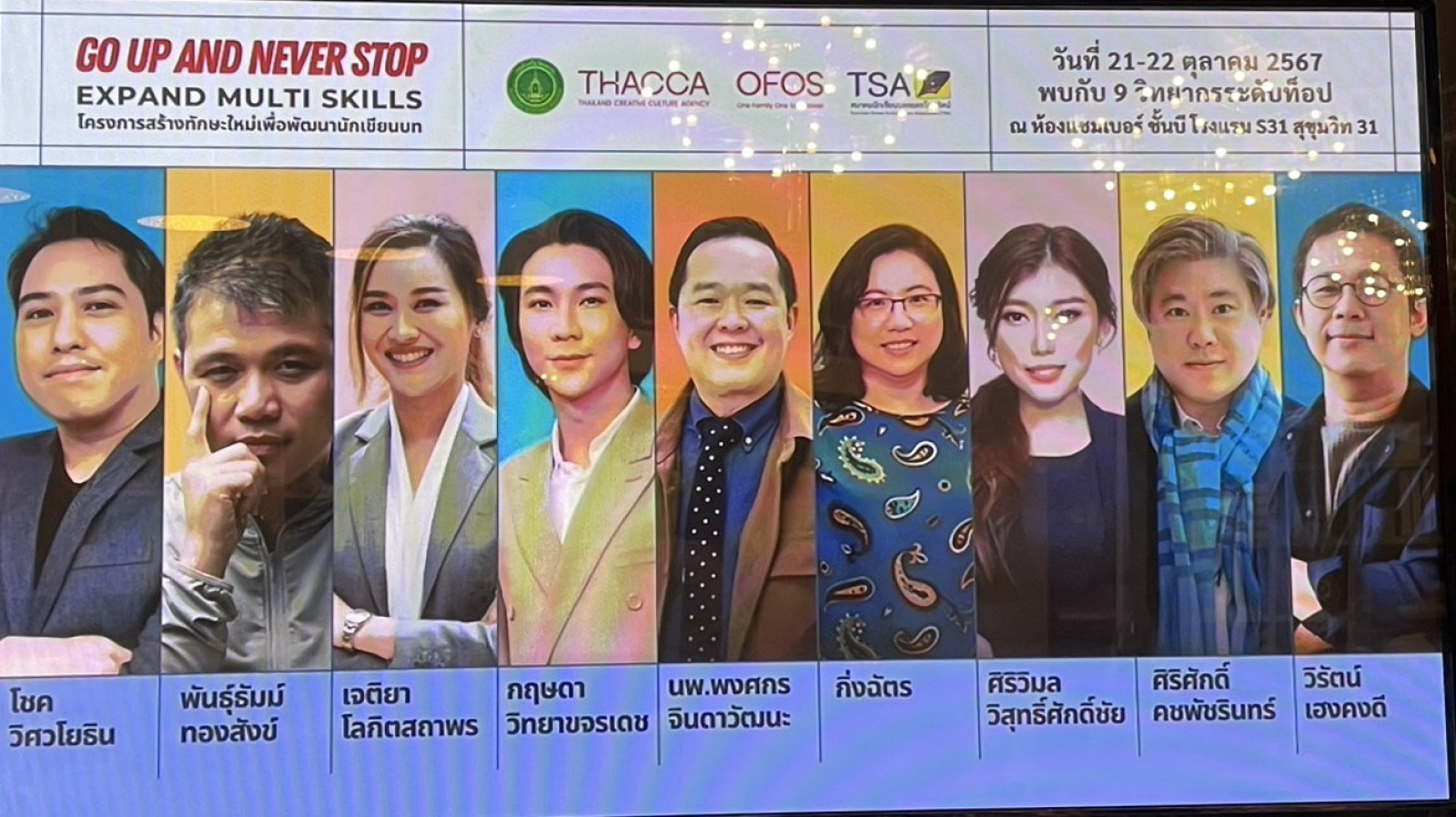 GO UP AND NEVER STOP . EXPAND MULTI SKILLS โครงการสร้างทักษะใหม่เพื่อพัฒนานักเขียนบท ซึ่งจัดโดยกรมส่งเสริมวัฒนธรรม THACCA OFOS TSA (สมาคมนักเขียนบทละครโทรทัศน์)
